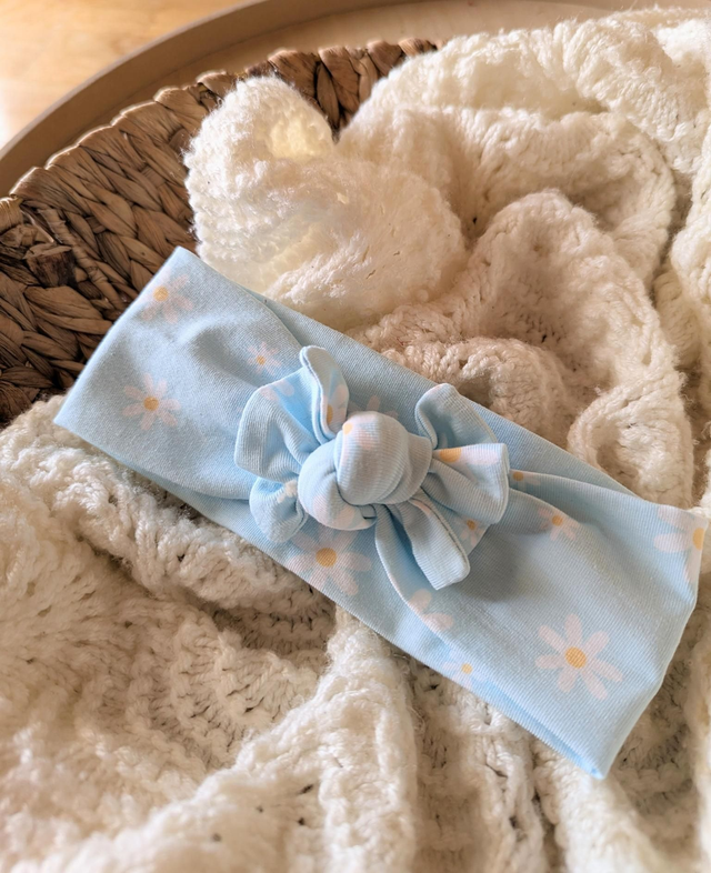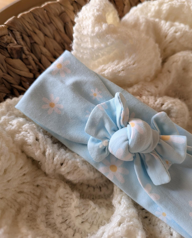 Craquez pour ce bandeau plein de tendresse, orné de jolies pâquerettes blanches sur un doux fond bleu ciel. Disponible de 3 à 12 mois, il apporte une touche de fraîcheur et de poésie à chaque petite tenue.