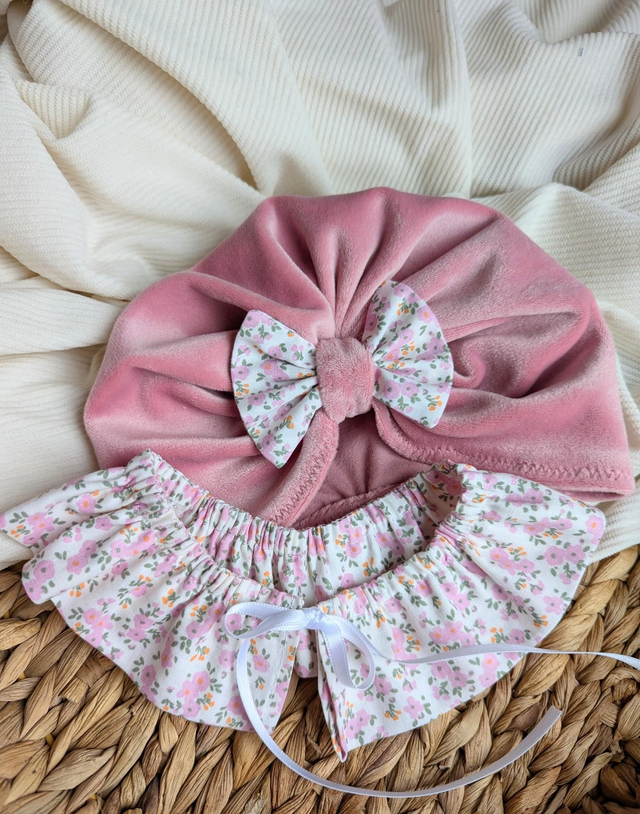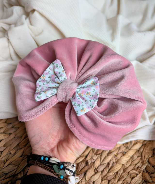 Confectionné dans un velours rose tout doux, ce turban est sublimé par un délicat détail fleuri.