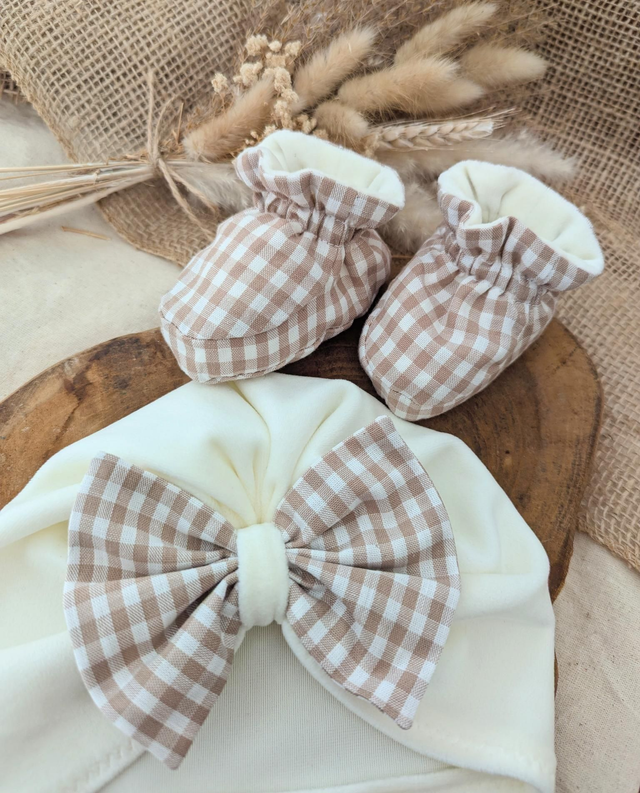Tissu en velours ras écru avec son détails nœud vichy marron glacé, doux et confortable pour les petites têtes 🤎